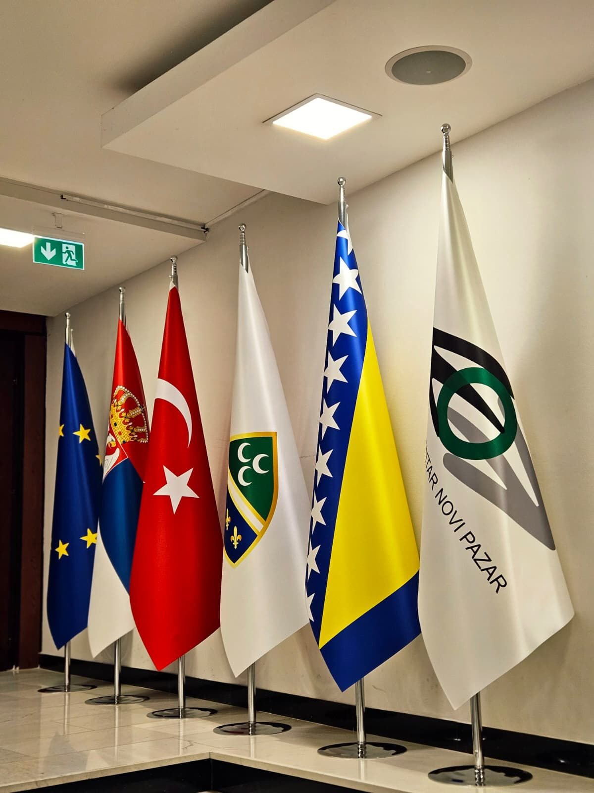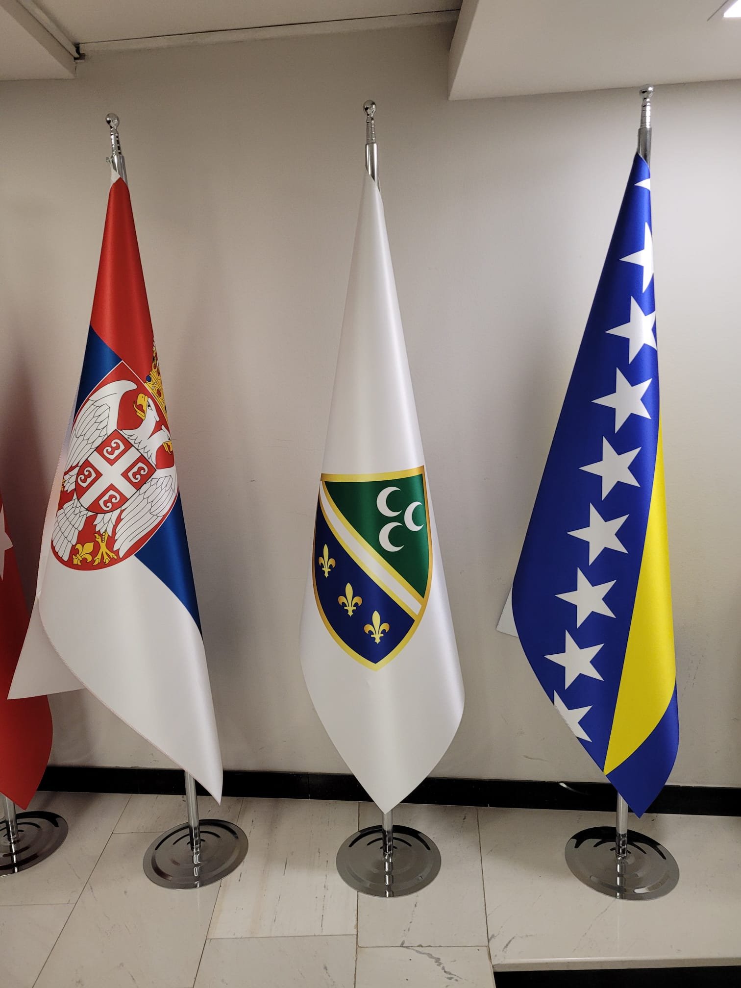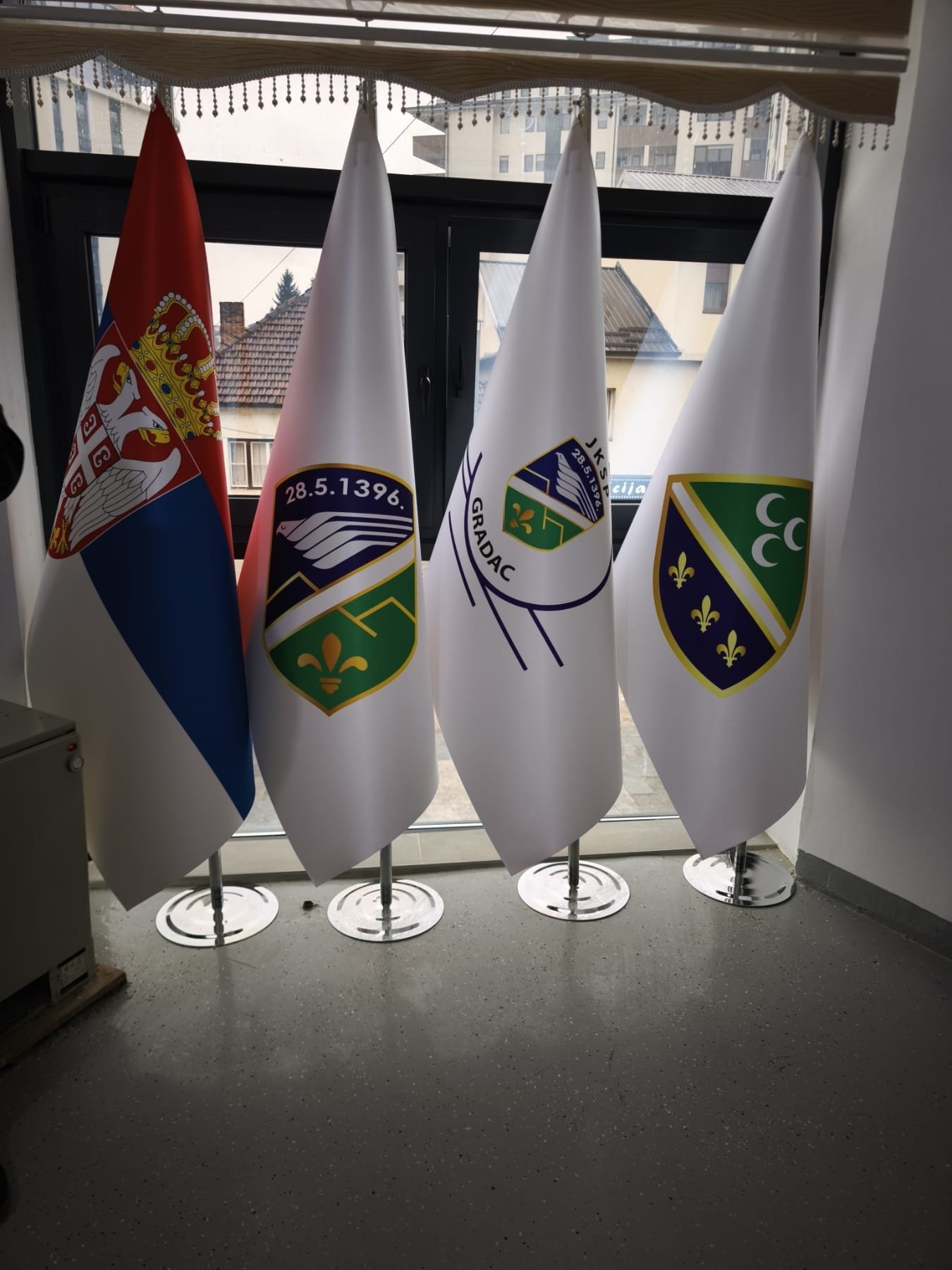 Kancelarijske zastave izrađuju se digitalnom štampom na satenskom platnu, čime se postiže visok kvalitet i postojanost boja.